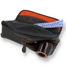 The Kenzo Black pouch is a mid sized combo design with ample storage for a pipe(or two small pipes), tobacco and as many accessories you could ever want. The lined tobacco storage is spacious and easy to access as the flap is lifted, which also doubles as a platform to catch any spilt tobacco. There is then another smaller zipped compartment under the flap for lighters and filters. Further to this the underneath has a large zipped compartment with leather loops for securely storing a couple of pipes and more accessories. The tobacco compartment easily holds up to 75g (or 3oz in old money) of tobacco.