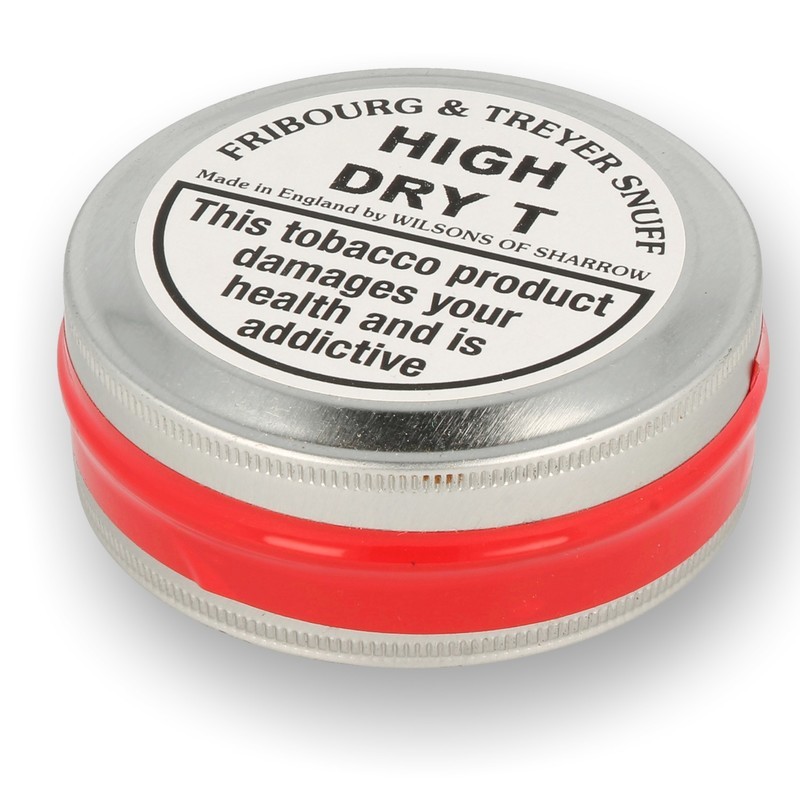HIGH DRY T (Formerly High Dry Toast) The Fribourg and Treyer High Dry T is a dry toasted blend of Zimbabwe Flue Cured stem, Dark fired leaf and Sun Cured leaf tobacco. It is a natural snuff of Irish origin and has a niche of it's own among the dry snuffs because of it's nutty flavour.