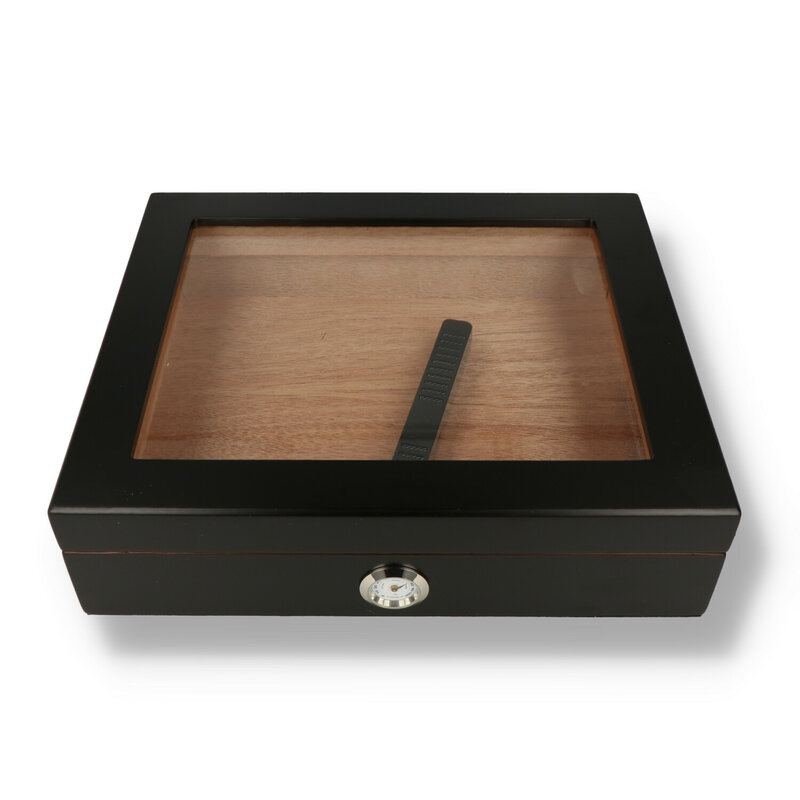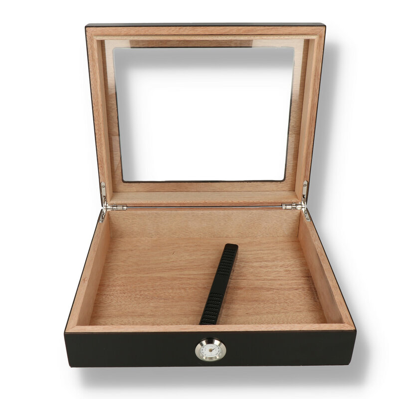 This stunning glass fronted desktop humidor holds between 10 and 20 cigars. Complete with hygrometer and humidification bar to keep your precious sticks in tip top condition. Lined with quality Spanish cedar which holds more moisture than most woods to help maintain humidity, and is not prone to warping or cupping in high humidity whilst imparting added aroma to your cigars. Comes with a humidity bar which can be filled with distilled water or humidification solution.