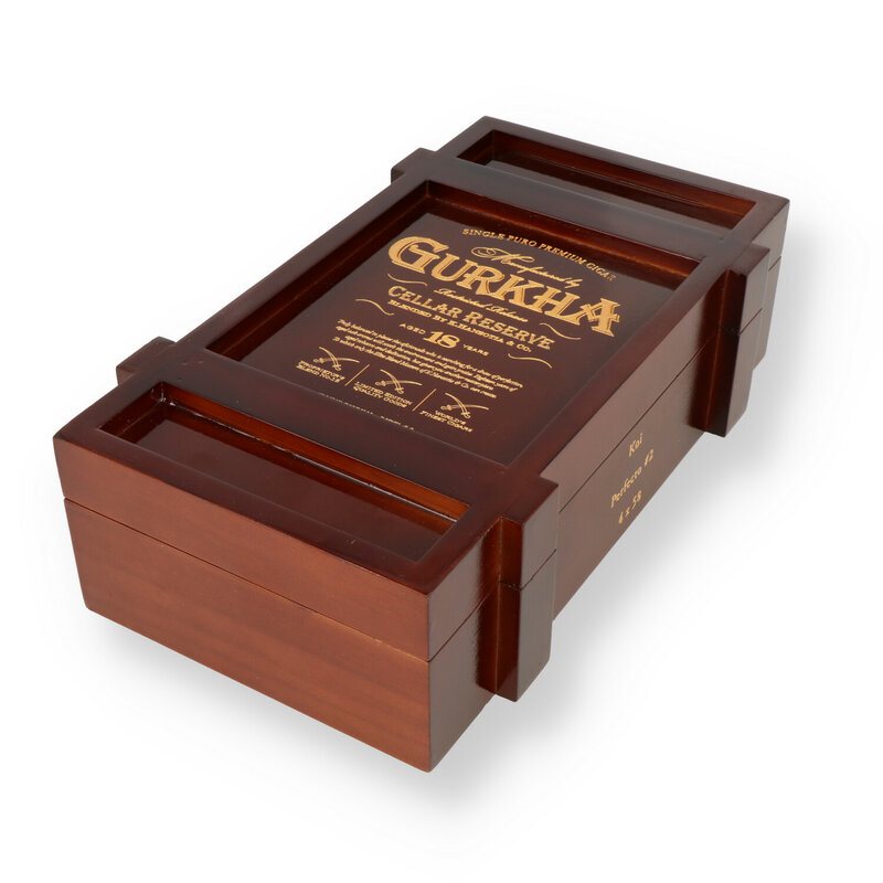 Nicaraguan Cellar Reserve Featuring a beautiful Dominican Corojo wrapper paired with an 18 year aged Dominican filler and binder. Gurkha partnered with the blenders to find the rarest tobaccos they could find and stumbled upon this 18 year old Dominican tobacco. This cigar is packed full of woody leather flavours with a slightly spicy creamy sweetness towards the middle. It is packaged in a piano finish mahogany box.