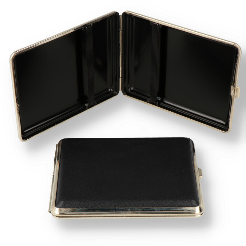 Leather Bound Cigarette Case These handcrafted leather bound cigarette cases have been expertly crafted from solid nickel before being bound in the finest soft leather. They have elasticised bands to hold the contents securely without damaging them and can be used to store not just cigarettes but business cards or bank cards or anything you like.