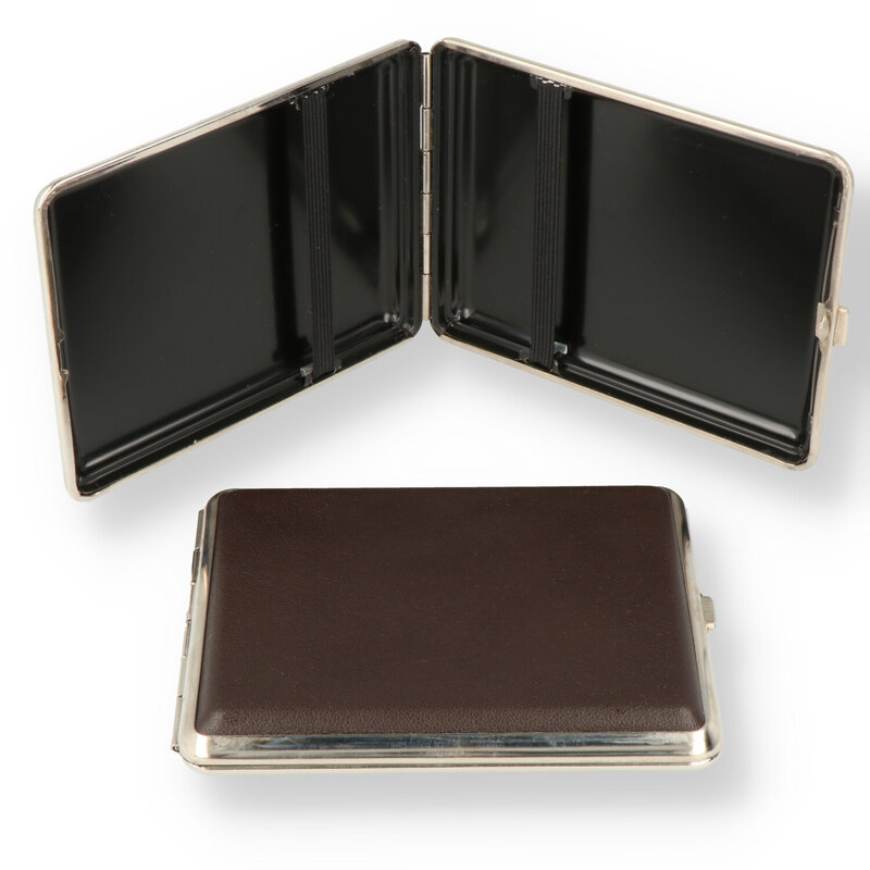 Leather Bound Cigarette Case These handcrafted leather bound cigarette cases have been expertly crafted from solid nickel before being bound in the finest soft leather. They have elasticised bands to hold the contents securely without damaging them and can be used to store not just cigarettes but business cards or bank cards or anything you like.