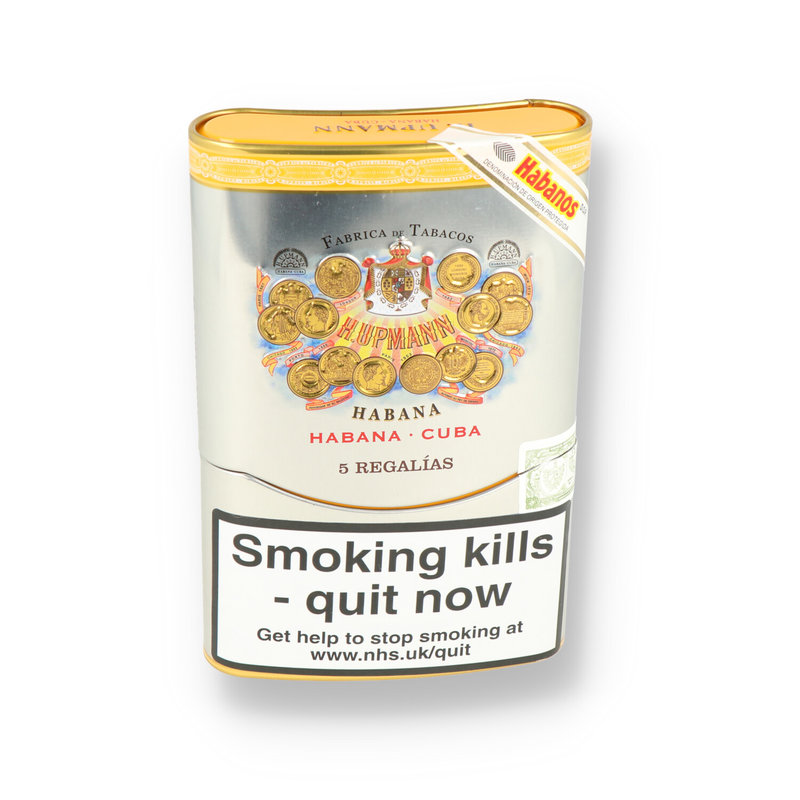 H.Upmann Regalias: Up until its discontinuation in 2002, the H.Upmann Regalias was a machine-made cigar not found in the UK, However, it has been re-released as a long-filler hand-made cigar and is now available in retro style curved tins of 5. A mild to medium strength cigar with herby leathery woody flavours that develop throughout the first half turning into sweet but spicy notes towards the end.