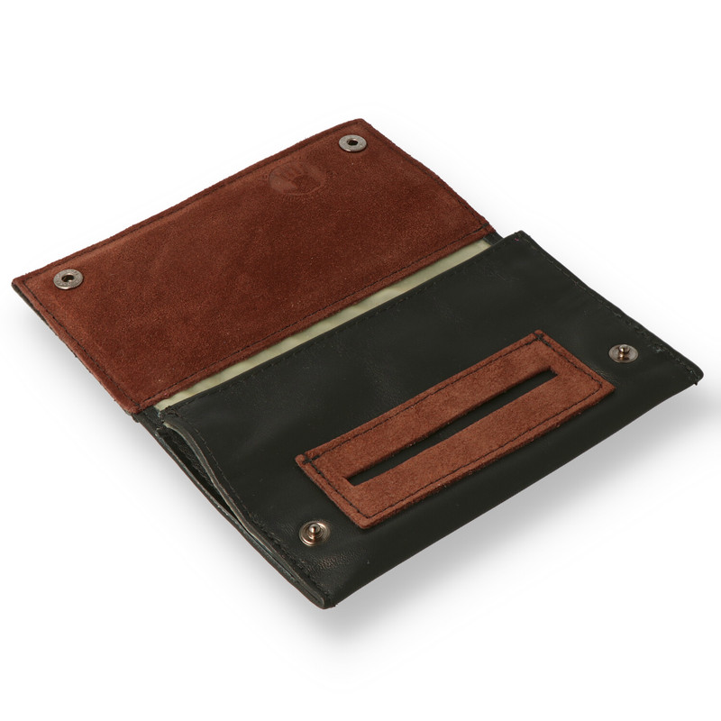 PTL Wallet Style Tobacco Pouches: Well where do we start …………. well we simply love them. The quality is as you’d expect from an Italian made product with design and usability fusing together to make an exceptional pouch. The wallet style Tobacco pouch is the timeless, benchmark design for Tobacco pouches. Neat, tidy and effective! One simple flap opens to reveal the Tobacco storage compartment and Ilmorellos unique accessories compartment that they integrate into the top of the Tobacco compartment without the need for bulky fasteners or zips. The lid of the pouch is fairly stiff so comes in very handy as a tray for preparing and rolling a ciggie on. We have imported our Ilmorello pouches with a latex lining. Latex is not generally used on the continent for some reason but being the knowledgeable folks we are at The UK Tobacco, we know that a latex lining is almost essential for keeping your Tobacco fresh so we had them customised. Of course no Hand Rolling Tobacco pouch is complete without the hand paper dispenser built in.