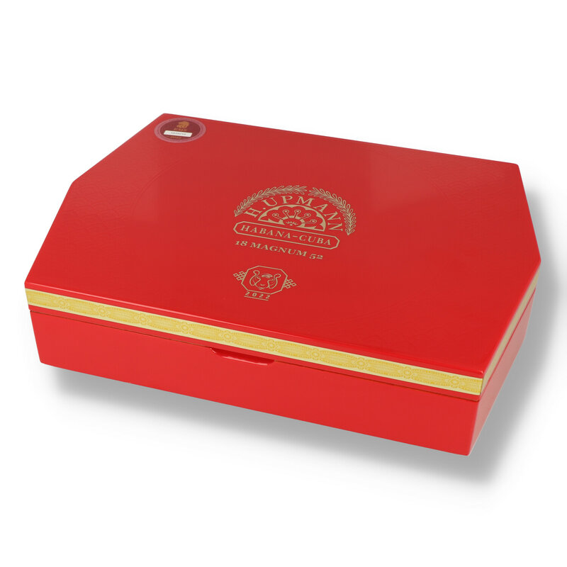 Magnum 52 Year of the Tiger H.Upmann have released these special cigars to commemorate 2022 the Chinese year of the Tiger. These glossy red 6 sided boxes hold 18 Magnum 52's all fitted with a footband depicting a tiger. The Magnum 52 is an elegantly complex cigar that produces layers of honey, caramel, black tea and biscuit. This beautifully constructed cigar with a chocolate brown wrapper is cigar worthy of any aficionados humidor.