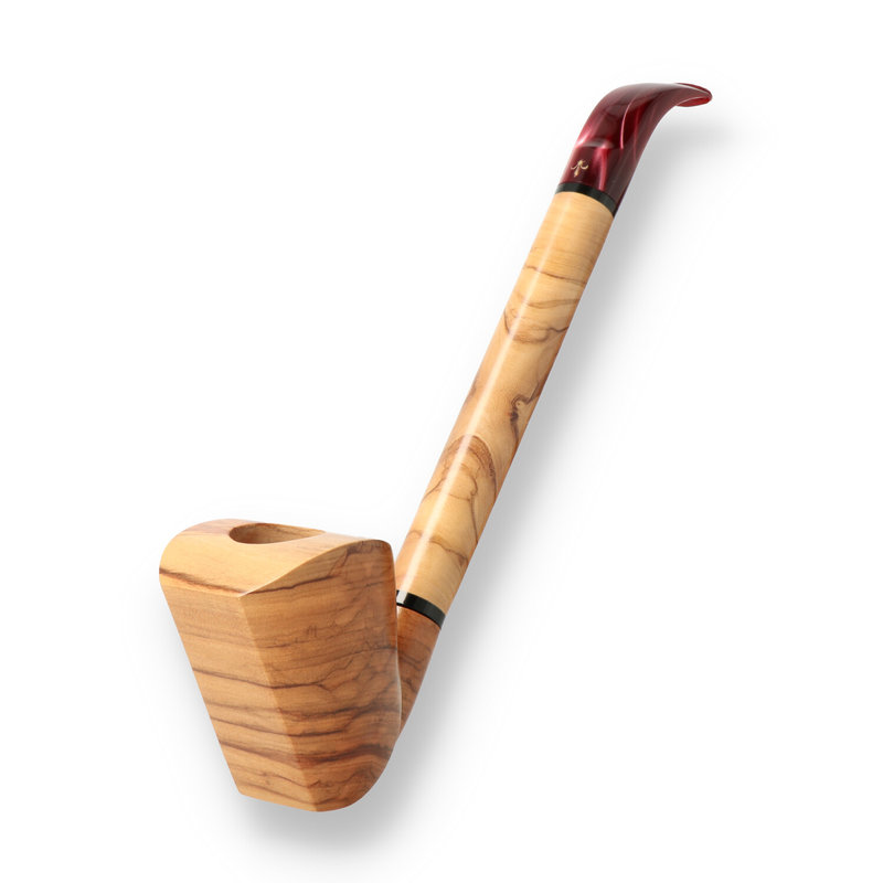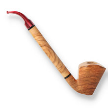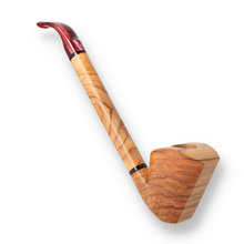 Mastro Grandolfo 0026 These stunning pipes are real head-turners. This freehand Olivewood pipe finished in a natural stain and Carnauba wax. The grain is simply stunning and is a testament to Mastro's impeccable craftsmanship and eye to detail. The long Olivewood shank ensures a cool smoke and is finished with a red pearlescent Cumberland mouthpiece.