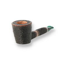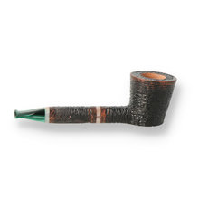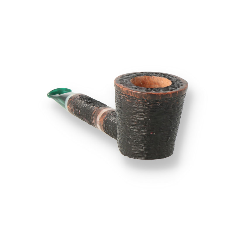 Mastro Grandolfo 0025 These stunning pipes are real head-turners. This Lovat has been masterfully created from high grade, well aged, strawberry root briar, which is a root burl from a strawberry tree. Strawberry briar has a wider grain that standard briar which lends itself more to rustication. The Rustic bowl and shank have been accented with marbled white rings and a stubby pearlescent green tapered stem.