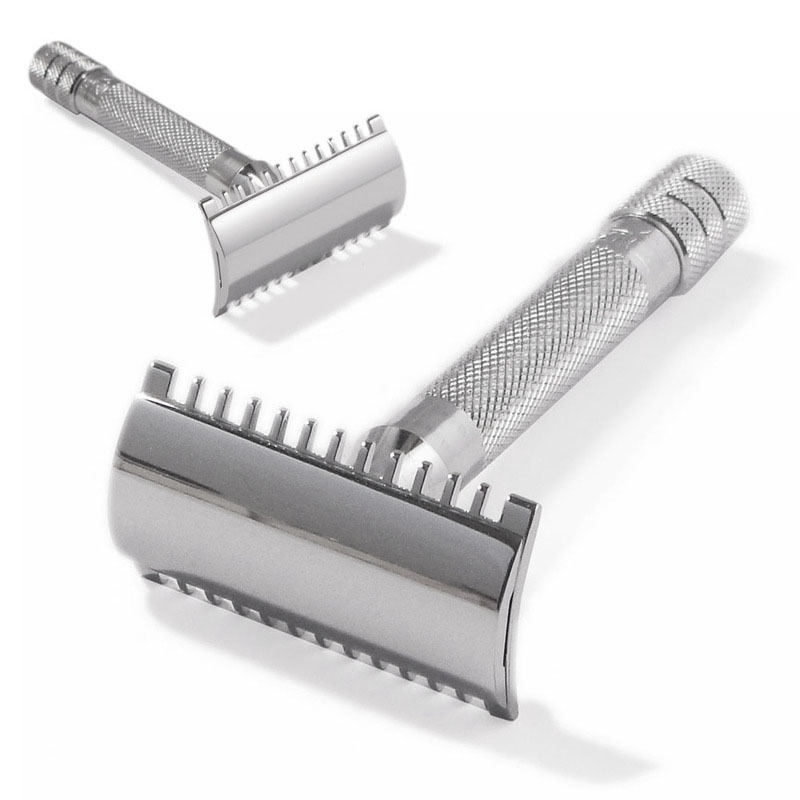 The Merkur 9015001 is a short handled, double sided, razor. The combed edges make the razor suitable for trimming beards as well as providing a close wet shave. When used with a quality cream or soap and preferably with a quality shaving brush you will feel exfoliated, less irritated and left wonder why you ever used a Mach 3.