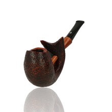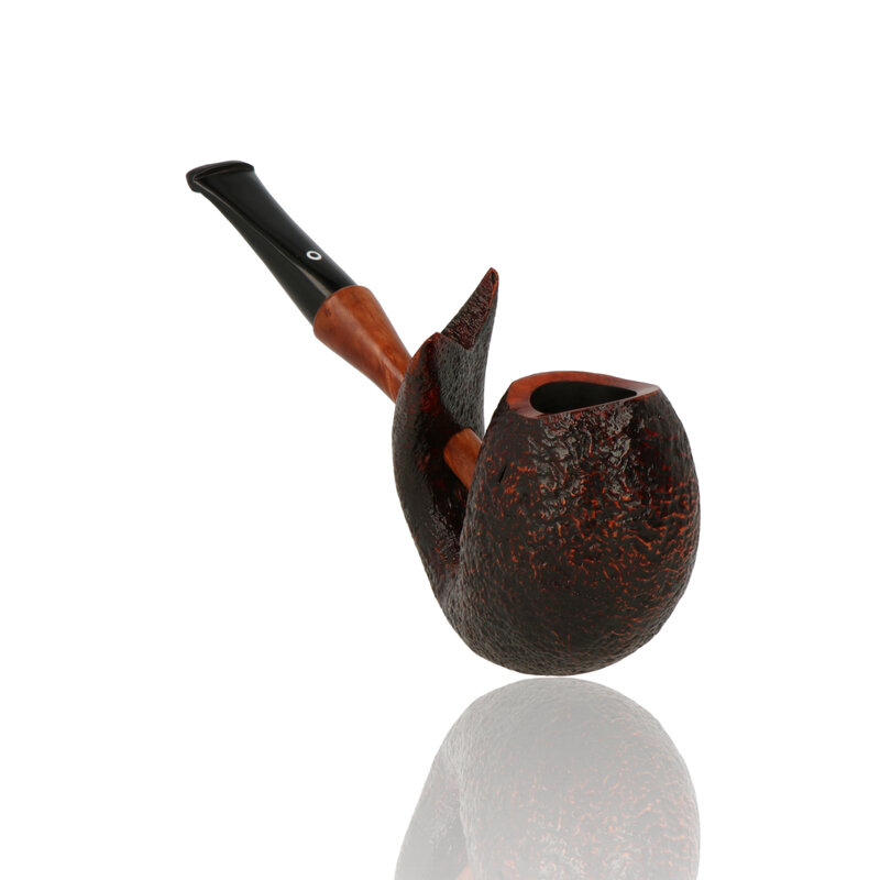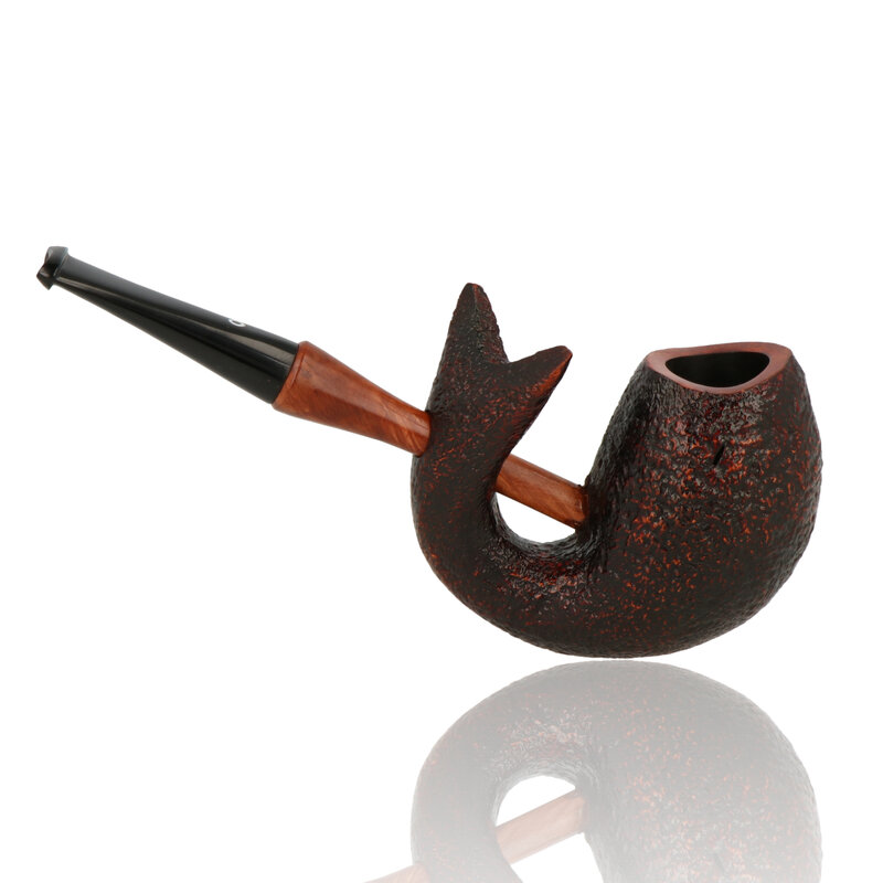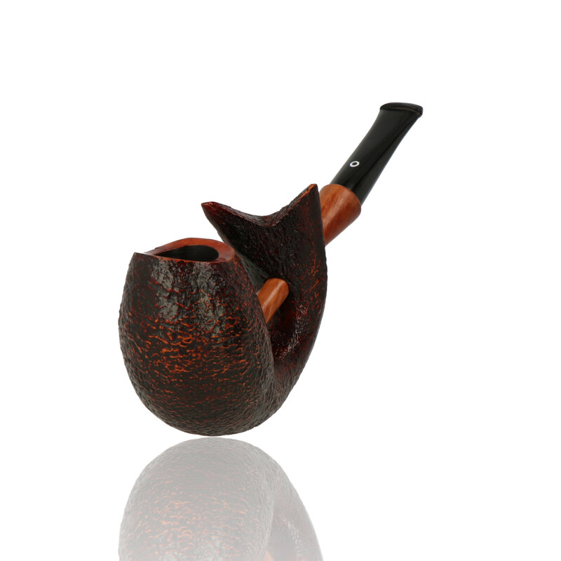 This is a stunning piece that is a true testament to Ian's artistic flare. A solid piece of briar has been carved out into the shape of a stylised fish finished with a deep brown stain and sandblast texture. This has then been speared by a long briar shank which tapers out to the tapered stem, such a conversation piece if you whip it out during a session but you will more likely want to keep it on display like the piece of art that it is.