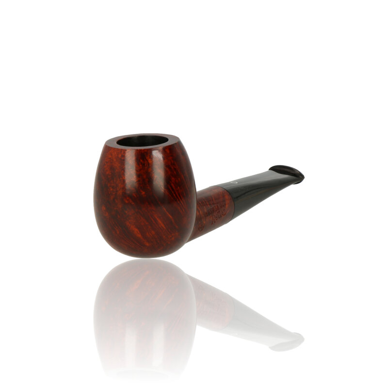 This Regal Apple is a beautifully classic Straight Apple in a dark stain and smooth finish. The grain is really nice with a flame grain running up the bowl from the bottom and a stunning birdseye grain on the opposite side. The Apple shape maintains the simple symmetry of a billiard but with a thicker walled chamber that draws heat away from the tobacco helping provide a cooler smoke. Finished with a classic black tapered stem.
