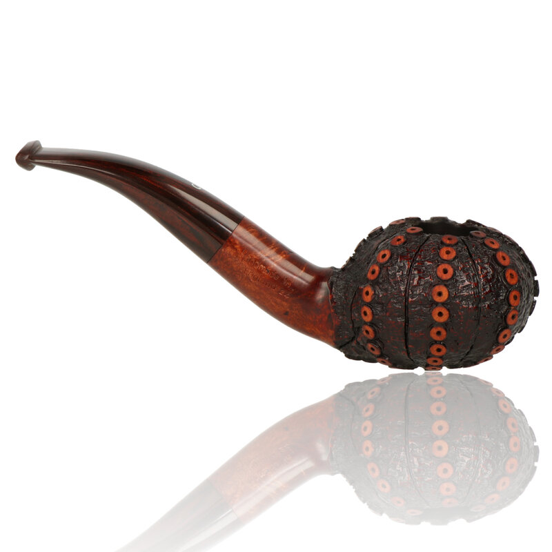 The Sea Urchin is one of Ian's most well-known signature pieces, the detail in the carving is testament to his dedication and skill he puts into his work. The pipe has very thick walls combined with the tentacle design acts as a heatsink drawing heat away from the bowl ensuring an ultra-cool smoke. The slight curve on the brown Cumberland stem means this is a really well-balanced pipe that sits comfortably in the hand and will for sure be a focal point of any conversation whilst smoking.