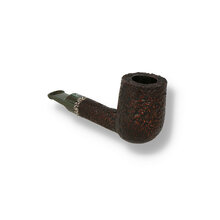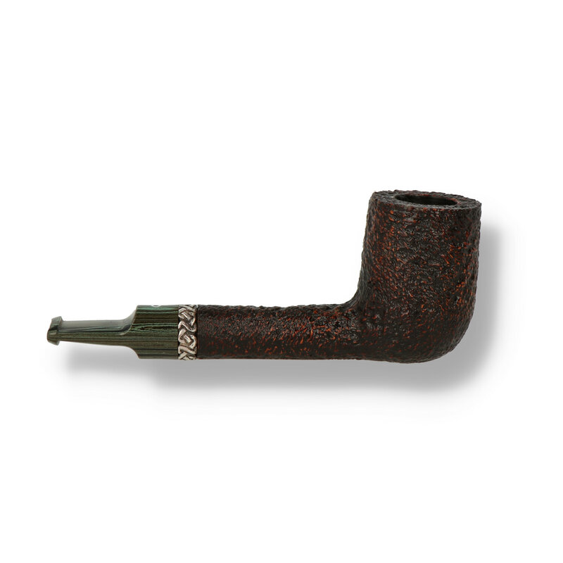 Banded Billiard This unique Rox Cut Group 4 Lovat is a well-proportioned Lovat which has been given Ian's unique 'Rox Cut' sandblasted finish and a rich dark stain. The thick walls and deep bore is perfect for a long relaxing smoke at any time of day and the extra long shank gives room for the smoke to cool ensuring a smooth puff every time. The pipe has been finished with a unique chain link silver band and a green cumberland saddle stem.