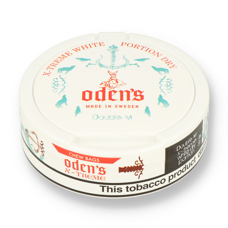 Oden's X-treme White Double M Powerful but well rounded and flavourful chewing tobacco blend with strong and cooling Mint and Menthol flavours. Extremely strong nicotine experience in unmoistened chewing portion bags. The tub contains a handy compartment in the top to discard of your used bags.