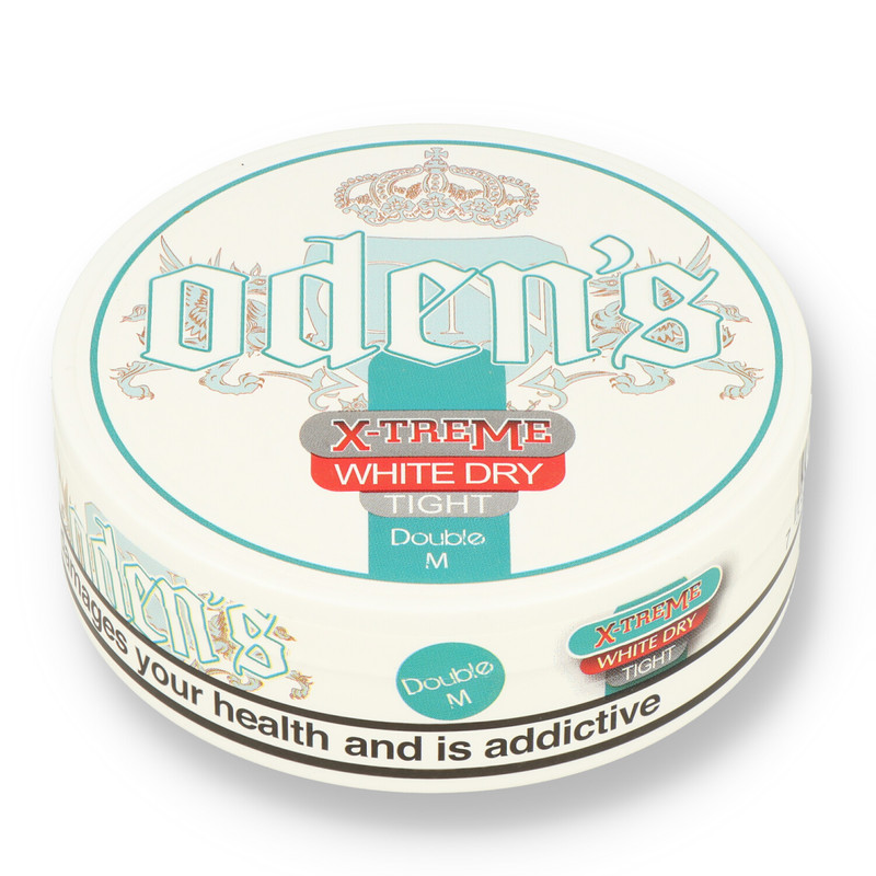 Oden's X-treme White Double M Powerful but well rounded and flavourful chewing tobacco blend with strong and cooling Mint and Menthol flavours. Extremely strong nicotine experience in unmoistened chewing portion bags. The tub contains a handy compartment in the top to discard of your used bags.