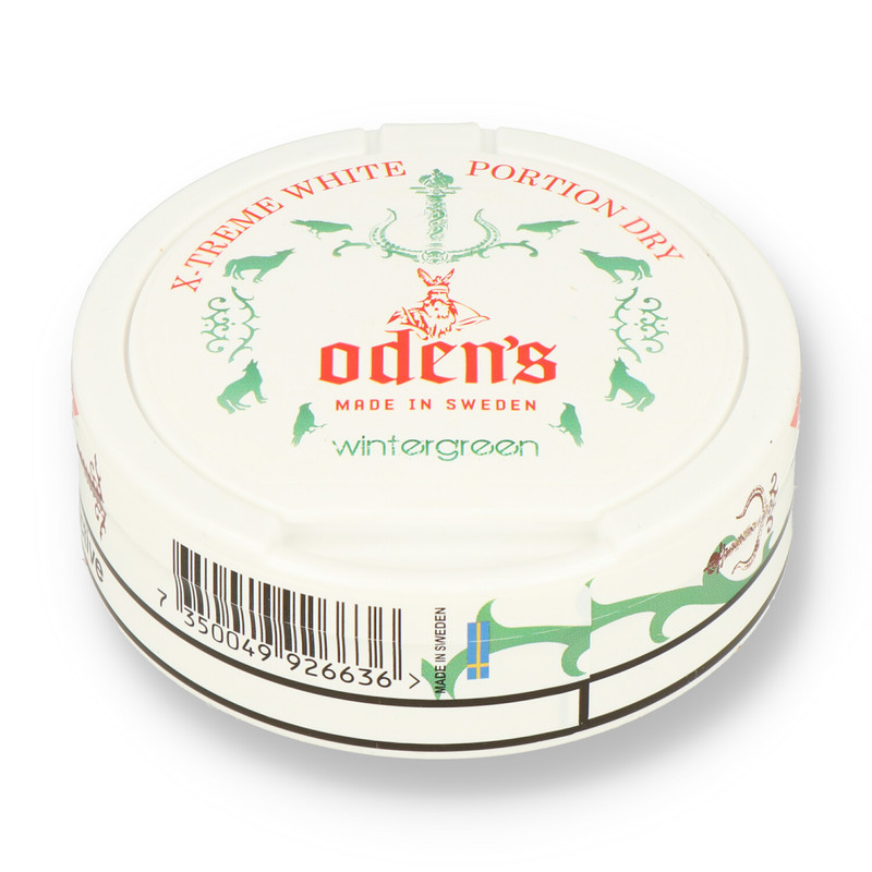 Oden's X-treme White Wintergreen Powerful but well rounded and flavourful chewing tobacco blend with strong and cooling wintergreen flavour. Extremely strong nicotine experience in unmoistened chewing portion bags. The tub contains a handy compartment in the top to discard of your used bags.