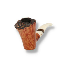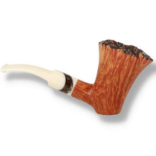Paronelli Half Rustic Intarsio 2047: The Paronelli Half Rustic Intarsio is another stunning freehand masterpiece from the Italian family company. Sometimes it seems a shame to rusticate a pipe and loose some of the natural features of the Briar grain but not when rustication is done this well with such an artistic eye. It takes a lot of experience and a keen eye to be able to produce a true rusticated finish with providence. The craftsmen needs to learn to follow the grain and natural features which takes years of experience to do well and this piece really demonstrates the skill that just oozes from the Italian workshop. A beautiful flame grain surrounds the bowl which is adorned with a stunningly sandblasted rim that brings out the natural birds eye grain. The quarter bent cream coloured saddle stem is finished with a matching briar dot inlay and zebrawood band