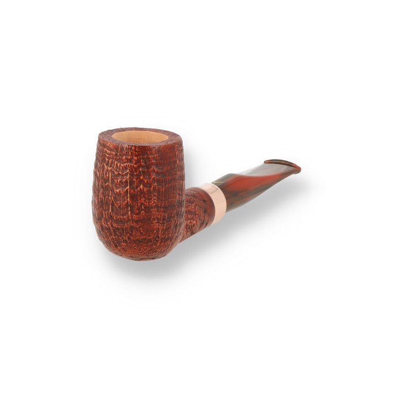 Paronelli Volkan Calypso This Volkan Calypso Sandblast is a classic straight Billiard in a stunning red brown finish. It has a stunning ring grain running around the bowl, topped off with a copper band and a brown marbled stem.