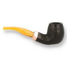 Paronelli Volkan Calypso This Volkan Calypso Sandblast is a classic bent Billiard in a matte black finish. It has a half diamond shank that fits wonderfully in the hand, topped off with a copper band and an orange marbled stem.