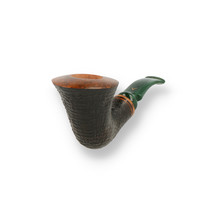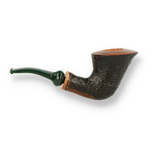 Paronelli Volkan Poesia This Volkan Poesia is a beautiful freehand shape with a stunning ring grain running around the bowl that has been expertly sandblasted before given a glossy black finish. The lip of the bowl has been polished smooth and given a brown stain to make the birdseye pop. The briar band and green cumberland stem finishes this stunning pipe off perfectly.
