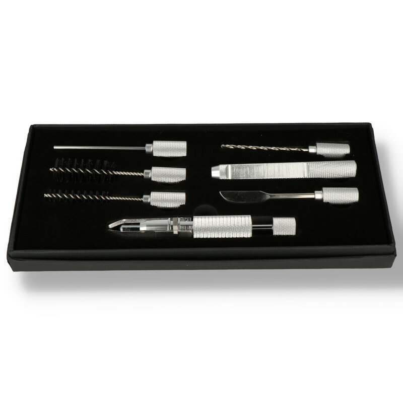 The Passatore pipe cleaning kit is the ultimate tool to remove carbon inside the bowl. If the crust is getting too thick as excess condensates gather there making for a bitter taste to your pipe. Moreover, it can also create high tension inside the bowl and can lead to damage to the briar. . Choose from one of the 7 tools including an adjustable Reamer, Drills, Brushes and cleaning knives all presented in a fitted presentation box.