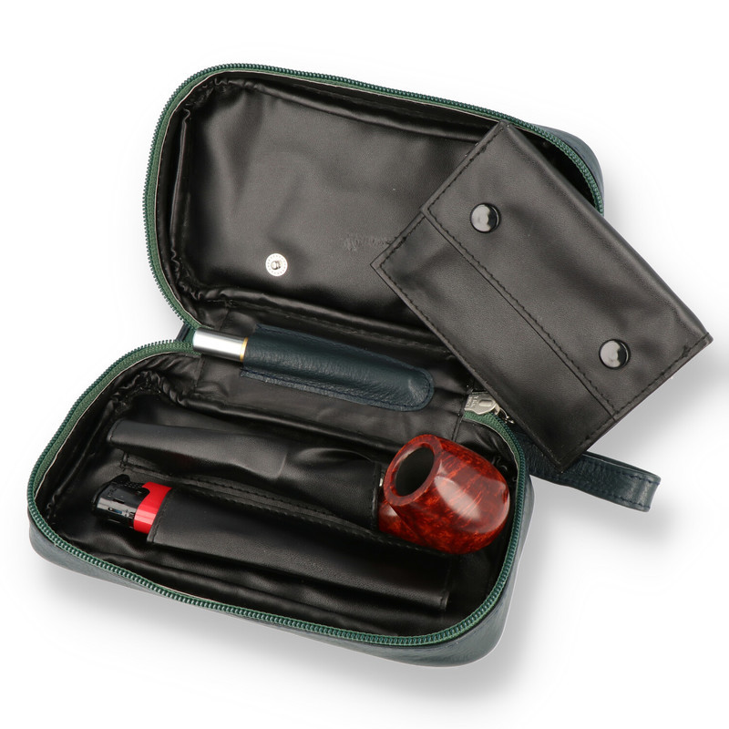 THE MUST HAVE ITEM FOR THE DISCERNING PIPE SMOKER ON THE MOVE The Peterson Pipe compendium stores and protects all your Pipes, Accessories and your favourite tobacco in one neat and secure quality leather pouch with an abuse friendly, heavy duty zip. The pouch consists of a large zipped compartment, which has two leather loops for securing pipes, a lined, a removable leather tobacco pouch for storing your favourite tobacco and a leather sleeve for a pipe tool. Even with all this there is still plenty of room for another pipe and as many accessories or extra pouches of tobacco you could wish to cram in. Then if this wasn’t enough lift the flap, which is secured by two magnetic studs to reveal 2 more slim compartments for more accessories, brochures, loose change or whatever else you wish to tuck away neatly. Then to finish the pouch there is a carry handle/belt loop for more convenient carrying