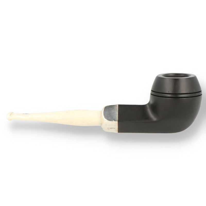 Peterson Evening Series The Peterson Evening Series is a new addition to the Army Series. All the pipes have a classic satin ebony finish that is beautifully contrasted with a marbled white and grey cumberland style acrylic stem. Each fishtail stem has been shortened to create a more compact pipe to the usual designs. The traditional Sterling Silver army mounted band and aluminium signature Peterson 'P' logo provide these pipes with a classic look.