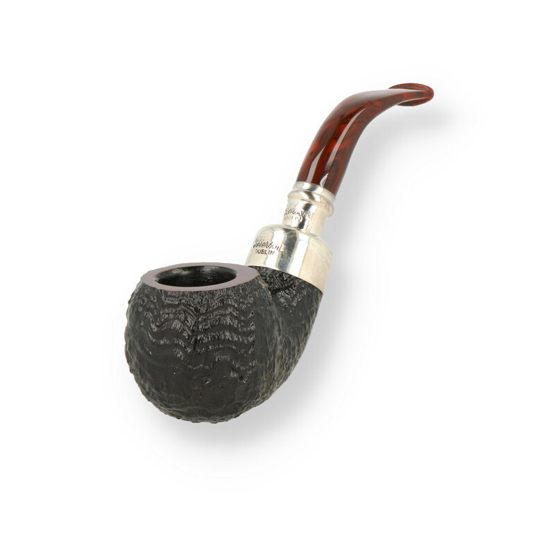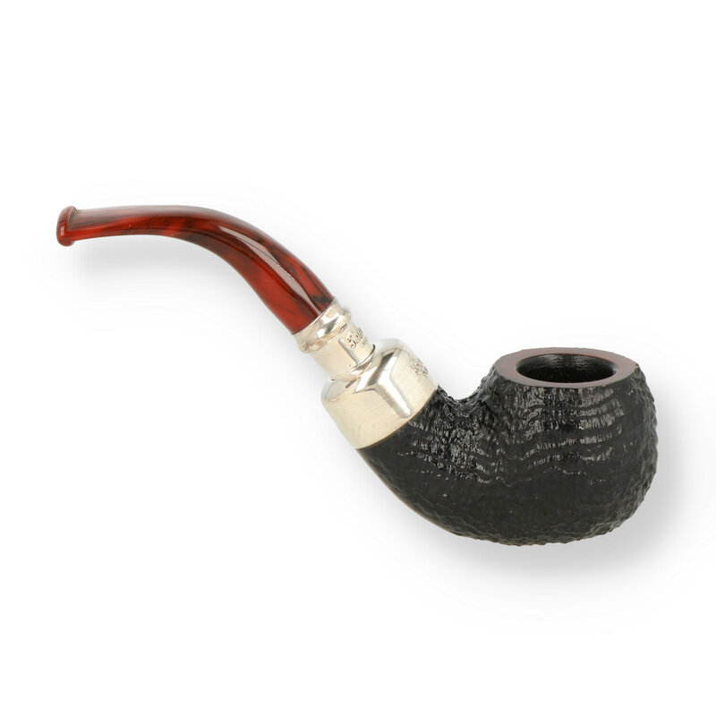 Peterson Newgrange Spigot: Peterson spigots are notoriously rare and usually take pride of place in any collection. The Spigot evolved on the front lines as soldiers repaired their pipe with a spent cartridge. Peterson evolved this into hallmarked sterling silver band and tapered fitting on the stem of a high grade pipe. Designed and named in honor of the iconic Irish prehistoric monument, the Newgrange Spigot reflects the central elements of this famous site. A signature Peterson spigot is expertly combined with a deep black sandblast briar and Cumberland mouthpiece. The pipe is elegantly finished with a smooth top that has been given a dark Irish oak colouring.