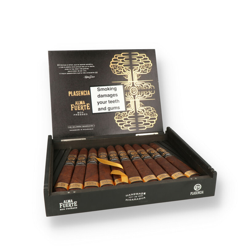 Plasencia Alma Fuerte The Alma Fuerte is a unique blend of their best aged tobaccos grown in the highest quality soils that accentuates their bold and vibrant flavours. Each leaf is aged over a 10 year aging process to bring out the natural sugars and developing the complex flavours of dark chocolate plum and cinnamon, the flavour profile is balanced with finishing notes of oak and molasses.
