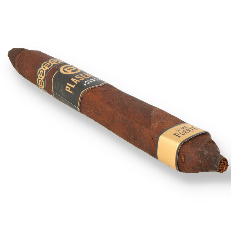 Plasencia Alma Fuerte The Alma Fuerte is a unique blend of their best aged tobaccos grown in the highest quality soils that accentuates their bold and vibrant flavours. Each leaf is aged over a 10 year aging process to bring out the natural sugars and developing the complex flavours of dark chocolate plum and cinnamon, the flavour profile is balanced with finishing notes of oak and molasses.