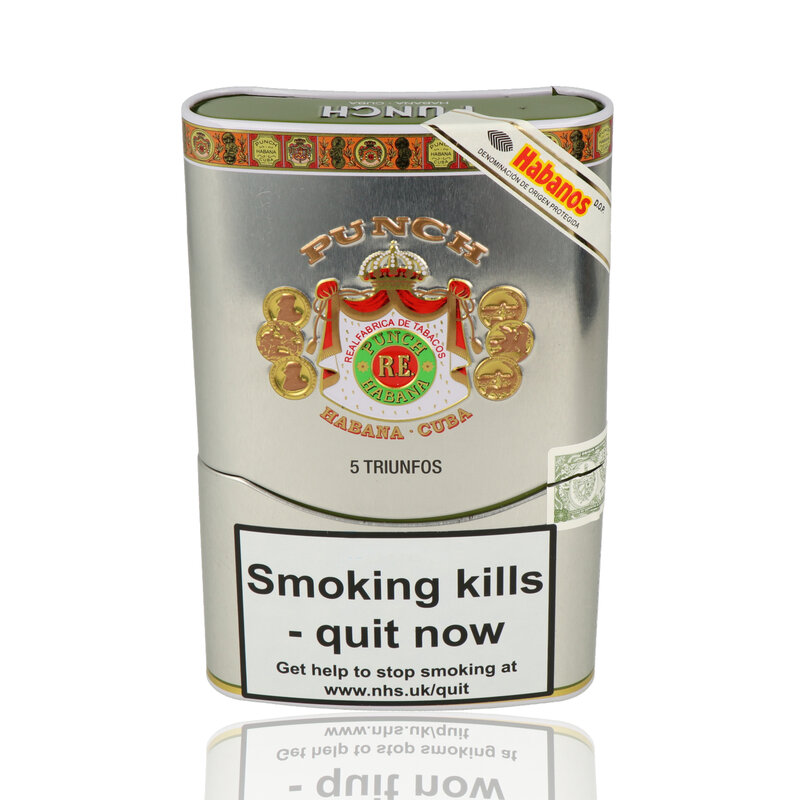 The Punch Triunfos Línea Retro contains five Cuban petit coronas presented in a vintage-style tin based on classic mid-century designs. Measuring 130mm by 42 ring gauge, these cigars offer a medium-bodied profile with clean woodiness, smooth nut flavours and gentle herbal notes. The robust metal tin makes the Triunfos an ideal option for carrying, gifting or enjoying a traditional Cuban cigar in a convenient format.