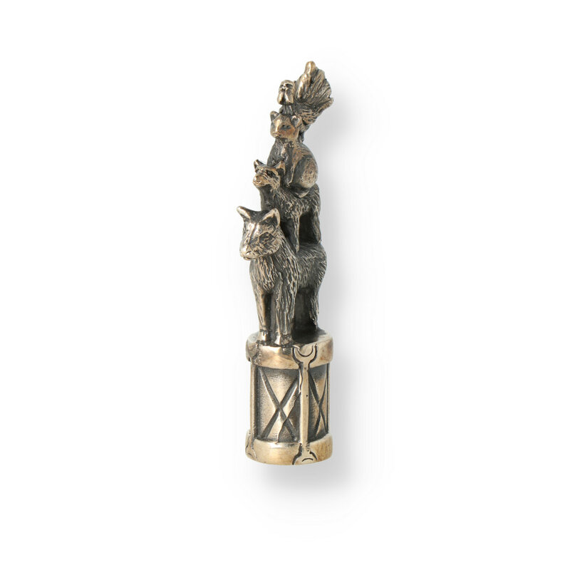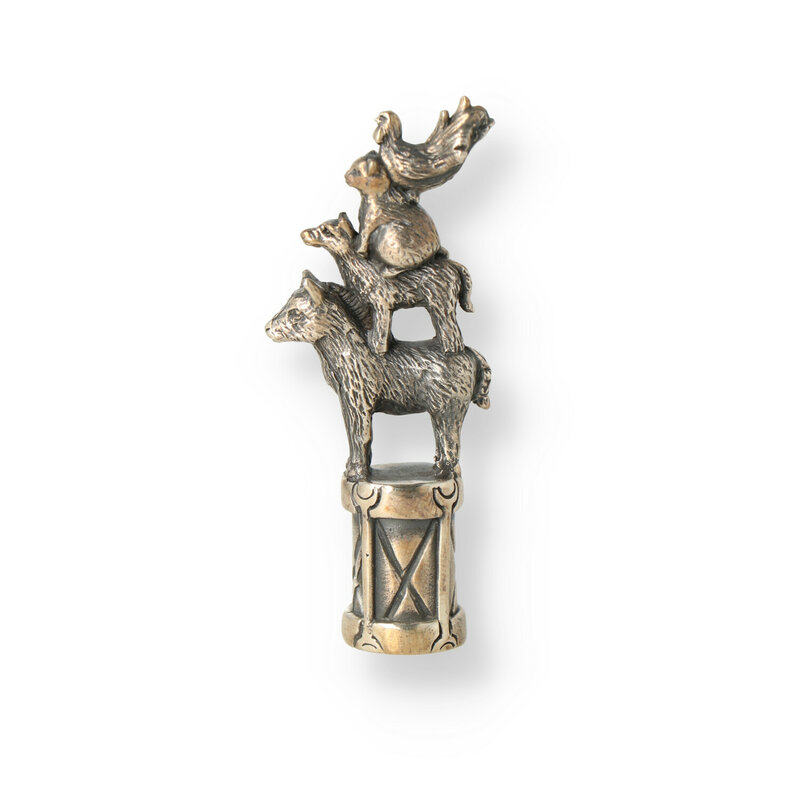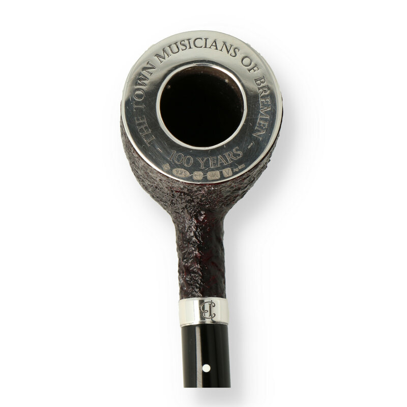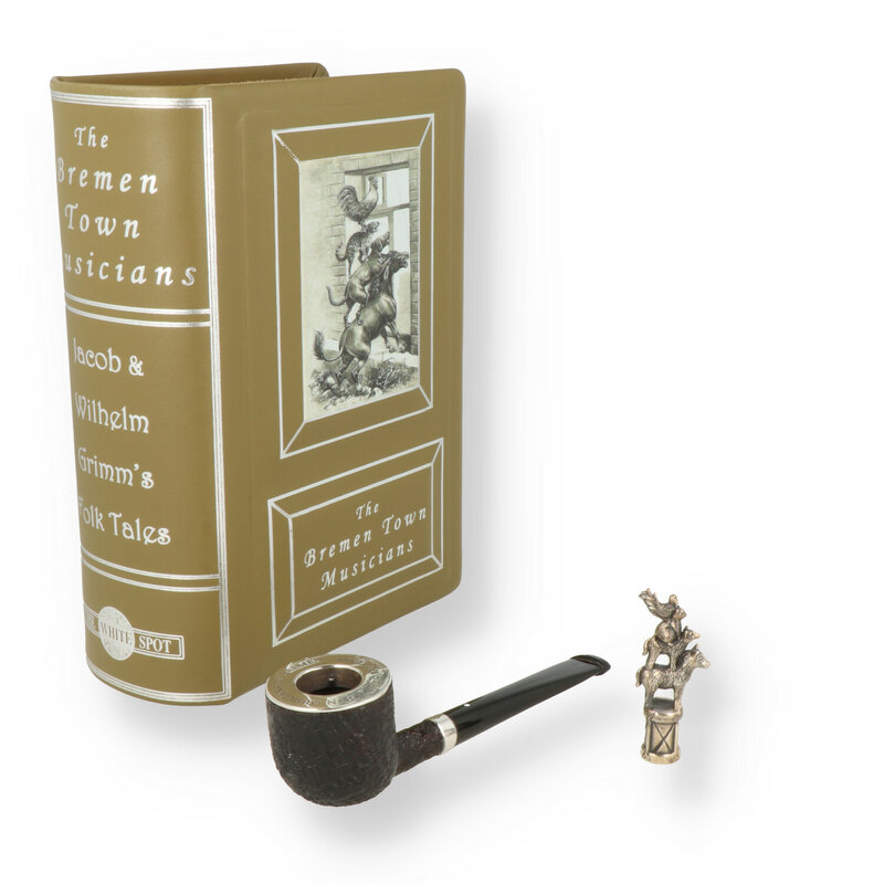 The Town Musicians of Bremen White Spot Pipe Conceptualised by Mlle. Léopoldine Favre, a young friend of the brand from Paris, the Town Musicians of Bremen pipes have been created and manufactured as the second series of limited edition pipes based on the stories and folk tales of the Grimm brothers. The Town Musicians of Bremen pipe is a very elegant Pot shape in Group 3 (3106). It is fitted with an engraved Sterling silver rim mount and band and each pipe is accompanied by a solid Sterling Silver tamper showing in finest detail the 4 animal friends forming a pyramid. The highly collectable The Town Musicians of Bremen pipes & tamper is presented in a prestigious leather bound book and come with a numbered and hand-signed limited edition certificate. The Solid Silver tamper is crafted from a weighty 34 grams of solid Sterling silver showing the animal pyramid formed by the donkey, dog, cat and rooster