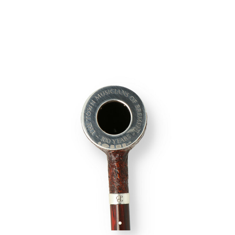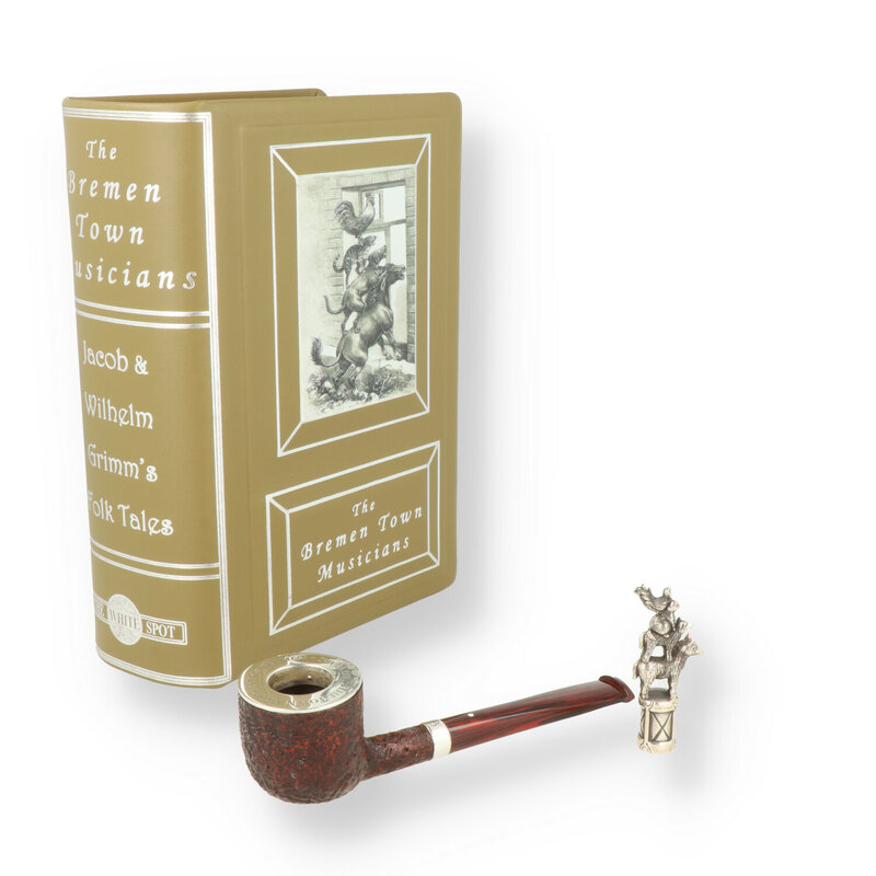 The Town Musicians of Bremen White Spot Pipe Conceptualised by Mlle. Léopoldine Favre, a young friend of the brand from Paris, the Town Musicians of Bremen pipes have been created and manufactured as the second series of limited edition pipes based on the stories and folk tales of the Grimm brothers. The Town Musicians of Bremen pipe is a very elegant Pot shape in Group 3 (3106). It is fitted with an engraved Sterling silver rim mount and band and each pipe is accompanied by a solid Sterling Silver tamper showing in finest detail the 4 animal friends forming a pyramid. The highly collectable The Town Musicians of Bremen pipes & tamper is presented in a prestigious leather bound book and come with a numbered and hand-signed limited edition certificate. The Solid Silver tamper is crafted from a weighty 34 grams of solid Sterling silver showing the animal pyramid formed by the donkey, dog, cat and rooster