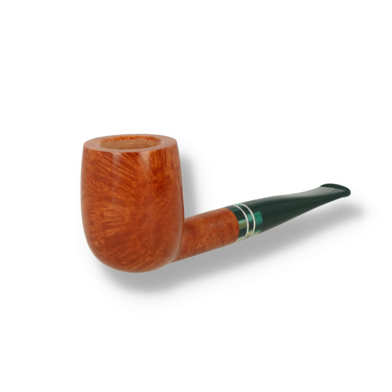 Savinelli Foresta Briar Pipes: There's nothing like a walk in the forest to cleanse the soul and heal the mind, why not upgrade your next forest trip with the Savinelli Foresta, Inspired by the rich fertile "forestas" of Italy these beautiful pipes are defined by a rich, green colour palette finished in a natural stain or a walnut rustication. Each unique acrylic stem reveals a rich, conifer green hue that leads beautifully into a trio of acrylic accents displaying a range of green hues from olive and pine to emerald and sage each separated by twin nickel rings. The The 310 is a generously constructed classic half-bent slanted poker shape. The flat bottom means you can set it down between puffs without spilling out your tobacco.
