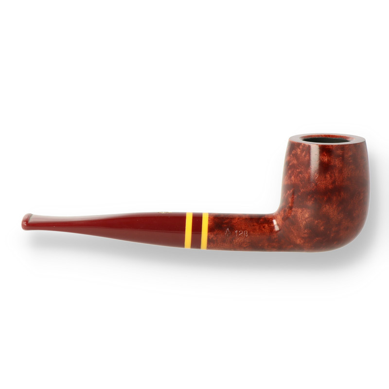 Savinelli Regimental 128 The 101 is one of the most recognisable pipe shapes there is, a classic straight billiard shape finished with a deep red stain and Savinellis trademark thick glaze. The Chestnut and gold coloured band is finished off with a tapered burgundy fishtail stem.