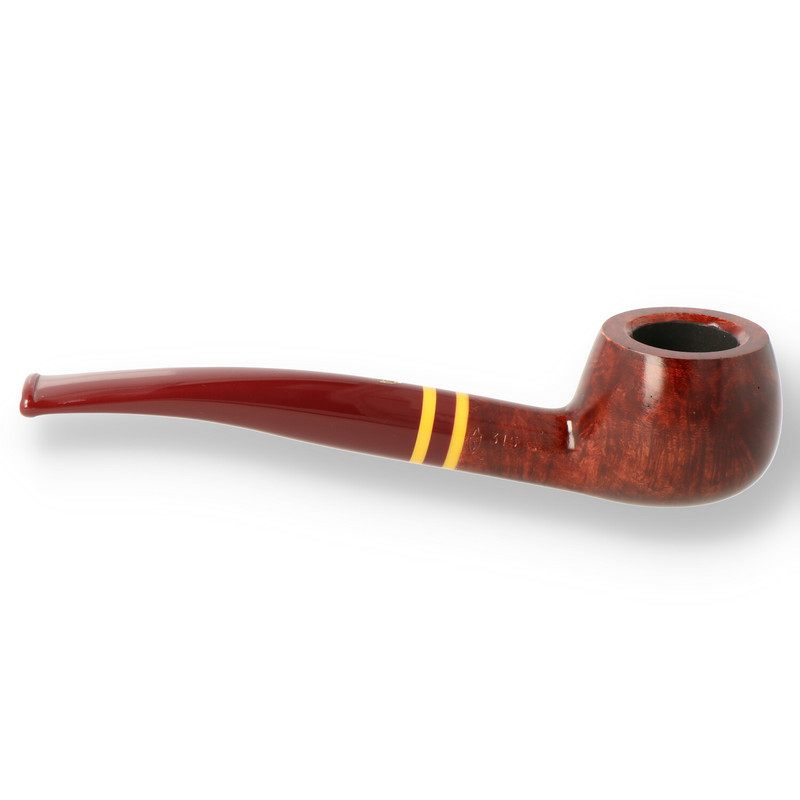 Savinelli Regimental 315 The 315 is a generously constructed classic half-bent prince. The thick walls of the bowl give a nice tactile feel in the hand with the added benefit of giving a lovely dry cool smoke. The Chestnut and gold coloured band is finished off with a chunky tapered burgundy curved fishtail stem.