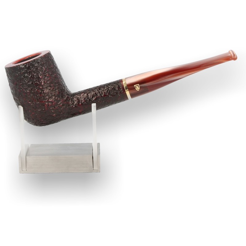 Savinelli Roma Lucite Rustic Briar Pipes: The Savinelli Roma Lucite is a beautiful pipe range made by the Italian style masters. Savinelli have their own unique style, which makes them stand out from any other brand. The Roma Lucite is a Rusticated bowl finished in a rich dark red stain which is left lighter on the raised areas. The rim is left smooth and matches the lighter red of the raised areas of the rustication which adds to the style without being too flamboyant. The pipe is finished with and Rose coloured marbled stem and Brass band.