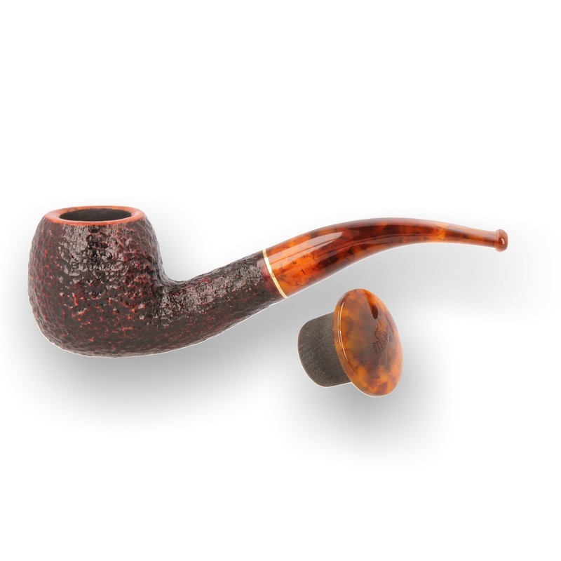 Savinelli Tortuga 626 The Savinelli Tortuga 626 is a classic full bent apple 6mm smoking pipe, very similar to the 602 with a shallower bowl to reduce the weight. The Tortuga has a stunning black, Sandblast finish on the bowl and contrasting tortoise shell effect, tapered, mouthpiece. The Apple shape is arguably the most comfortable bowl shape for most palms and the briar wall stays thickest where it is needed the most, which helps keep the pipe cool along with the smoke. Bent stems are generally more popular and it’s not solely down to Sherlock Holmes. The exaggerated curve gives the smoke longer to cool down and the exaggerated curve naturally forms condensation, which helps remove moisture and impurities from the smoke.