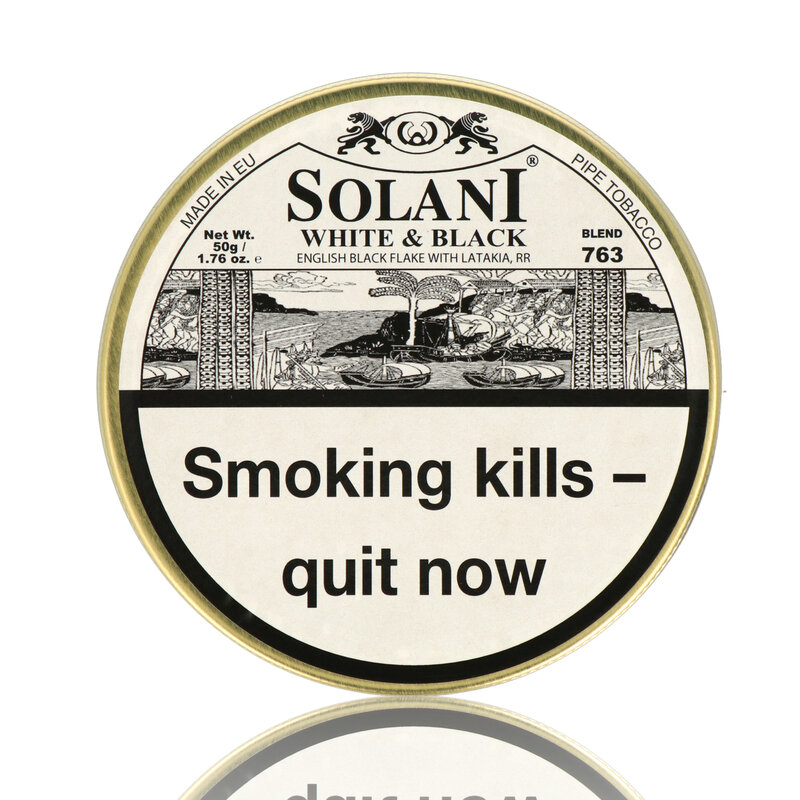 Solani 763 White & Black Broken Flake Pipe Tobacco The Solani White & Black 763 is blended from a balanced blend of the finest Dark Virginia, Black Cavendish and Latakia Leaves. The blend is then pressed into a flake and cooked under pressure to intensify the flavour and bring out the natural sweetness of the Tobacco before being broken up into a ready rubbed form for your convenience and enjoyment. No additional casing or flavouring is added to this blend so the true Tobacco flavours and expert blending can be fully appreciated and enjoyed.