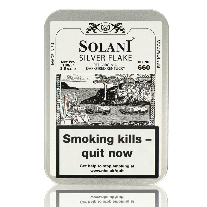 Solani Silver Flake Pipe Tobacco The Solani Silver Flake is an incredible Pipe Tobacco blended using premium dark red and sweet Virginias from the "Border Belt", light yellow Virginia from South Carolina and dark-fired, spicy Kentucky leaves. It has been cooked under pressure before slicing into a long flake. There is no additional casing or flavouring for those who appreciate the natural raw flavour of quality Tobacco.