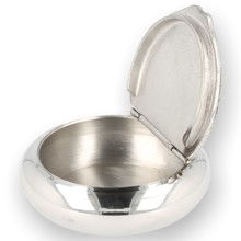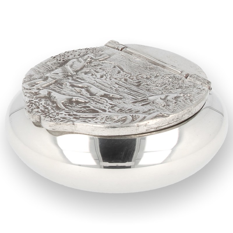 This snuff box is crafted from solid Pewter adorned with a great country scene featuring a gentleman with 3 dogs which we believe to be pointers but don't hold us to that we are tobacconists not dog groomers. It has a good tight lid but Pewter snuff boxes are designed more as a daily stash of snuff not for long storage. Pewter cannot be made with enough precision to get an air tight seal so will not maintain your snuffs moisture or flavour for long.