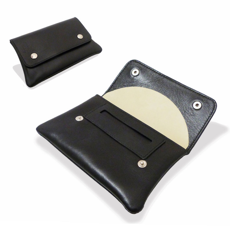 Wallet Style The Wallet style of hand rolling tobacco pouch is one of the most popular pouches due to the pocket friendly dimensions and usability. The wallet style is very simple, incorporating two pieces of Leather sewn on top of each other with one left longer to make a flap. When open this flap makes a cigarette preparation area and allows any spillages of that precious tobacco to be easily guided back into the de-luxe latex lined tobacco compartment. The flap incorporates two press studs so that the pouch can be securely fastened and the tobacco safely inside. As with most Hand Rolling specific pouches a Leather paper dispenser is neatly sewn on the fornt of the pouch.