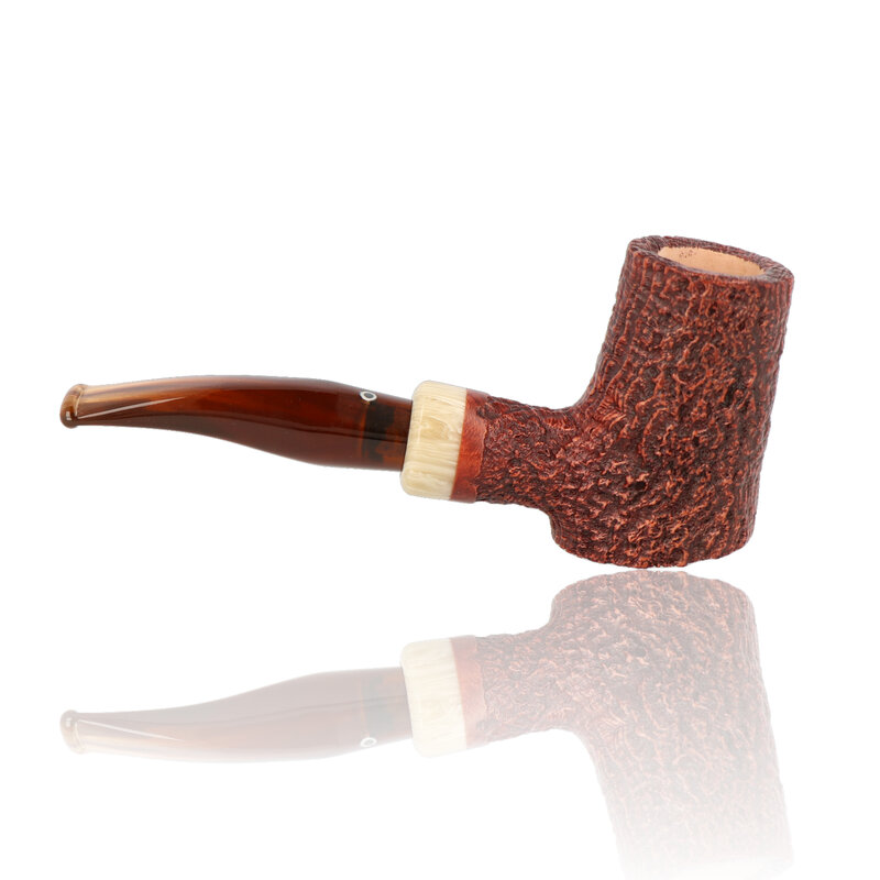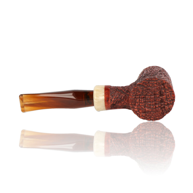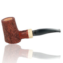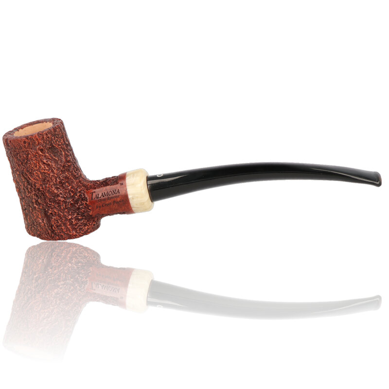Talamona di Paolo Croci Mini Reverse This slanted poker reverse calabash is a stunning example of the high quality workmanship expected to come out of the Talamona studio. It's generous sized bowl sits wonderfully in the hand and is finished with a chestnut stain and rusticated to produce an ultra cool, sweet smoke. There is a cumberland acrylic band and it also comes with a choice of a dark amber stem, a brown cumberland stem, a dark grey stem and a black churchwarden stem. These pipes are truly a work of art and it will be a real dilemma as to whether you will want to smoke it or put it on display for all to see.