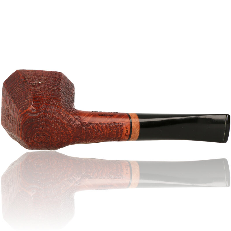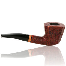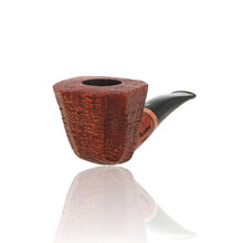 Talamona di Paolo Croci Sabbiato This half bent panelled Freehand is a stunning example of the high quality workmanship expected to come out of the Talamona studio. It's generous sized bowl sits wonderfully in the hand and is finished with a delicately grained sandblast bowl and chestnut stain which brings out the stunning ring grain running around the bowl. The rim is accented with a beautiful birds eye grain. The jet black stem is made from Acrylic with a light stained briar band. These pipes are truly a work of art and it will be a real dilemma as to whether you will want to smoke it or put it on display for all to see.