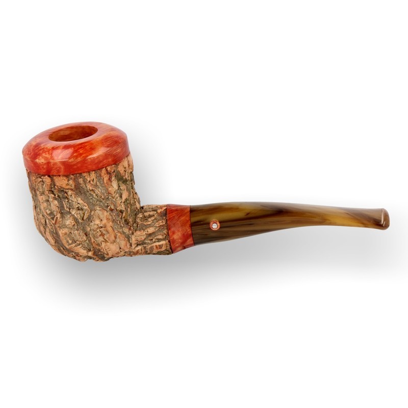 Tommaso Spanu Sughero Pipes: Tommaso Spanu are the only pipe manufacturer that produce these unique, striking and quite simply put outstanding pipes. The process is laborious and can only be done by hand but produces something really special that you will cherish for years. I'm sure we don't need to tell you how striking these pipes are and even more so in the flesh. A high grade block of Spanu home grown Briar is shaped and clad with natural Oak Cork before being fitted with a wonderful marbled mouthpiece which compliments the pipe beautifully. This pipe has left the Briar exposed on the rim and the shank for a contrasting effect against the cork. The cork is a robust coating, which is very comfortable to hold but also aids in cooling the pipe.