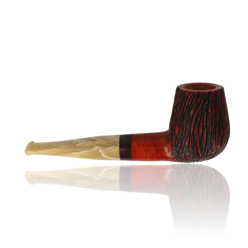 The Tommaso Spanu Half Rustico Brushed is handmade in Sardinia from locally harvested briar. The design features a half-brushed rusticated lower bowl and a smooth polished upper finish, creating a natural contrast. Fitted with a hand-cut acrylic stem and open draw, the pipe is comfortable and well-balanced. Each piece is made from start to finish in the Tommaso Spanu workshop, where the briar is grown, seasoned, and carved by hand.