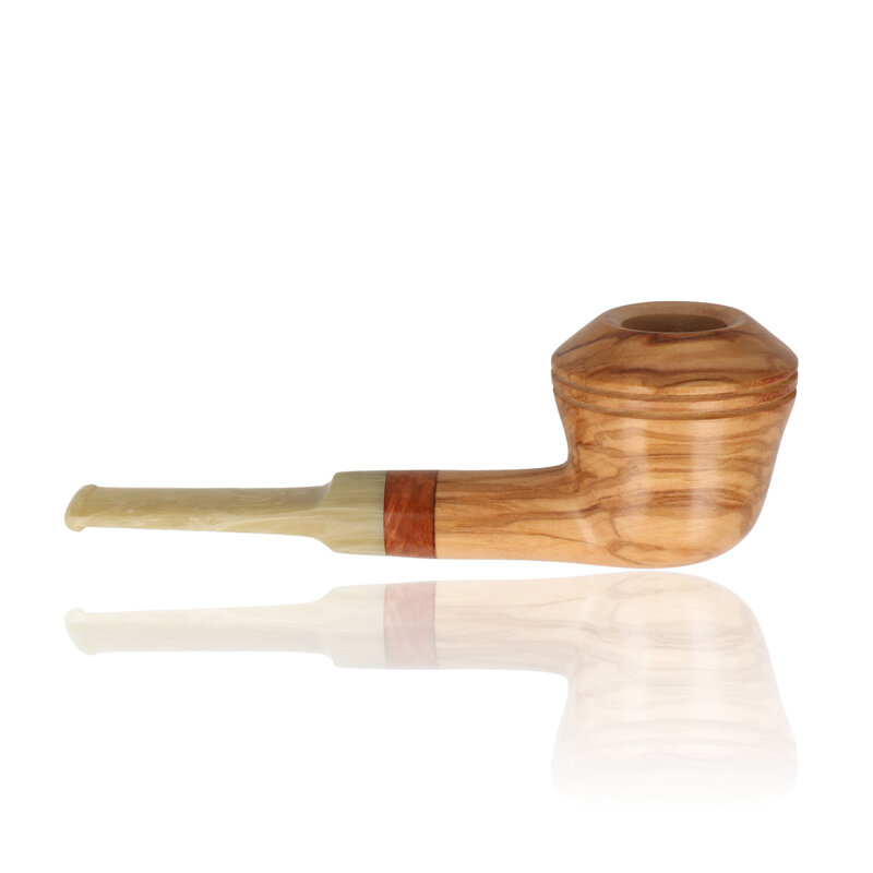 The Tommaso Spanu Olivastro Freehand with Briar Band is handcrafted in Sardinia from solid olivewood, finished with a contrasting briar accent and a hand-cut ebonite stem. Each piece is shaped, drilled, and polished entirely in-house at the Spanu workshop, where every stage of production is handled by the maker himself. The natural olive grain gives each pipe a unique look and texture, complemented by the warmth of the briar band. The Freehand shape offers a comfortable balance and open draw, combining organic artistry with traditional Italian pipe making.