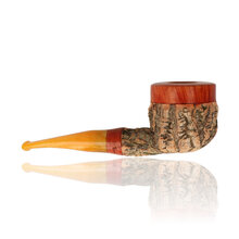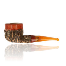 The Tommaso Spanu Sughero with Cork Display Stand is a handmade 9mm-filter pipe crafted from Sardinian briar and clad in natural cork. It features a smooth briar rim, a honey-coloured bent acrylic stem, and comes with a matching cork presentation tray. Each piece is made entirely in Spanu’s Sassari workshop, using cork harvested and finished by hand on the island.