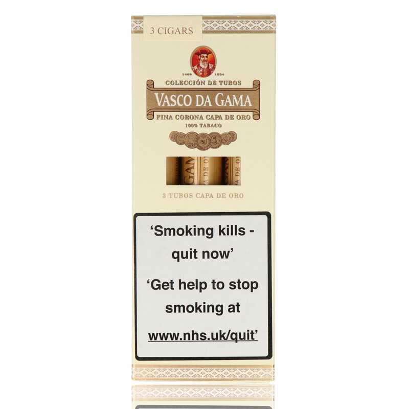 Vasco Da Gama Fina Corona Capa De Oro: The Vasco da Gama range is is homage to one of the greatest sailors in history and provides an insight into the journey you will go through while enjoying a Vasco Da Gama. The Capa De Ora range is rolled using some of the finest Cuban leaves which are well renowned for producing the most complex, spicy and rich flavours. The Vasco Capa De Oro offers true Cuban flavours without being too heavy. Each cigar is wrapped in a thin sheet of Cedar which adds character and complexity to this great Cigar.