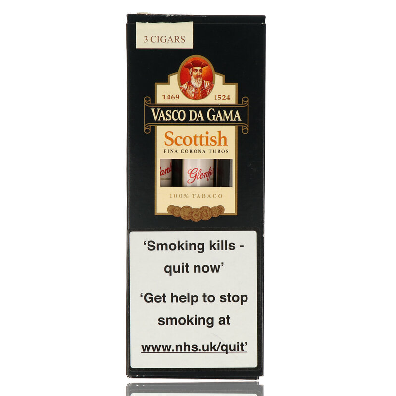 Vasco Da Gama Whiskey Flavoured Corona: A raw Vasco da Gama cigar is already in itself a superb cigar rolled using some of the finest tobacco leaves that Cuba and the Dominican have to offer wrapped in a sublime Sumatran wrapper. The Whiskey range is enhanced further with a unique ageing process in a room adorned with aged oak sherry barrels containing the 12 year aged Glenfarclas Whiskey which itself is aged in aged Sherry barrels. The result is a spicy sweet flavour that balances beautifully with the elegant flavours of the Vasco Cigar. Arnold Andre go that extra mile that no other machine made manufacturer goes to and discover dizzy new heights which rival any Hand rolled cigar for complexity. With great respect to the greatest sailor in history that Vasco Da Game are named after, Arnold Andre go the extra mile with this range of Cigars. They venture where no other machine made manufacturer dares explore. The efforts are well rewarded with excellent Cigars that rival Hand rolled cigars for complexity and character.