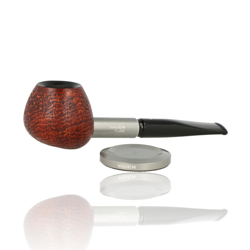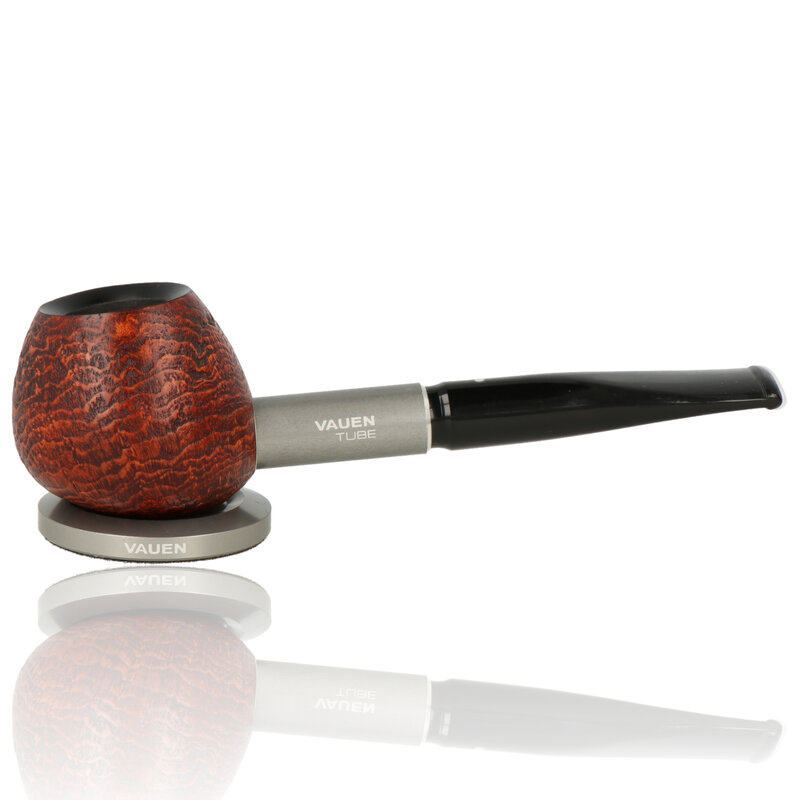 Vauen Tube The Vauen Tube is a very modern standing pipe with a hand flattering design. The pipe has a very interesting feature in that it has a small metal piece embedded in the base of the bowl and comes with a magnetic stand to sit it down between puffs. The stunning ring grain is perfectly accented with a stainless steel shank which not only gives it an eye-catching aesthetic but also helps to keep the smoke cool.